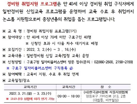 경비원으로 취업하려면 ‘일반경비원 신임교육’을 법령상 필수로 이수해야 한다. 이에 구로구는 교육부터 취업 알선까지 지원하는 프로그램을 마련했다.