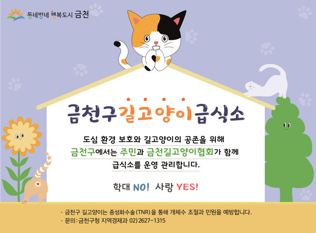 급식소 운영 관리는 주민과 금천구 길고양이 협회가 함께한다. 길고양이 협회에서 급식소 1곳당 돌봄 주민 1명을 지정하고, 주민은 사료 급여, 주변 청결 관리업무를 담당하게 된다. 또한 출입고양이 개체 수 확인 및 중성화율을 모니터링하고, 금천구는 이를 토대로 중성화 수술(TNR)을 진행하여 개체 수를 조절할 계획이다.