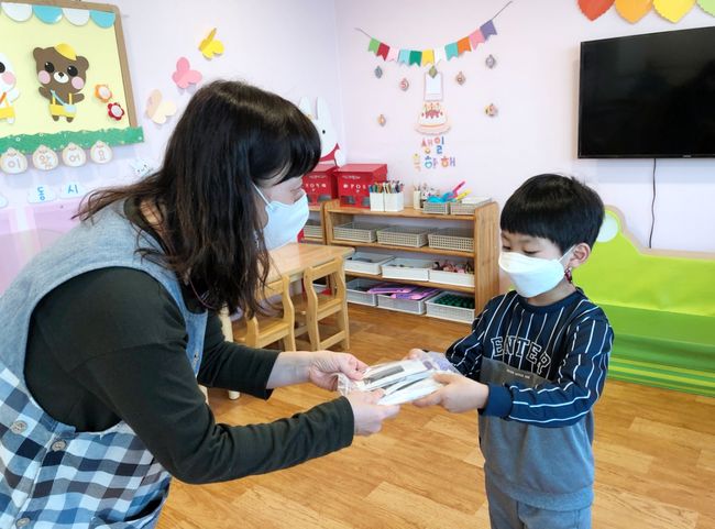 새 학기가 시작된 지난 2일 관악구청 직장어린이집에서 원아에게 신속항원검사키트를 배부하고 있다