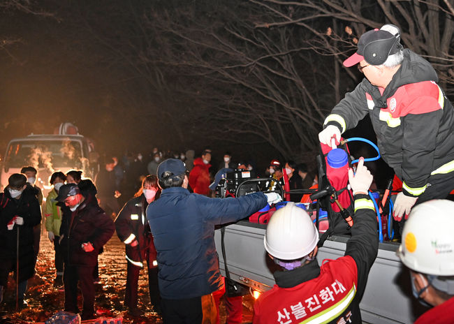 수원시 공무원들이 산불 진화 장비를 메고 산불 발생 현장으로 이동하고 있다.