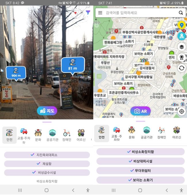 또한, 앱 상의 AR버튼을 눌러 증강현실 모드로 진입하면 카메라를 통해 주변 시설물들의 정보를 더욱 실감나게 알아볼 수 있는 장점도 있다.