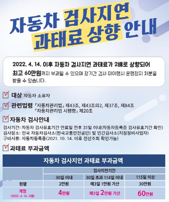 자동차 검사지연 과태료는 검사지연기간이 30일 이내인 경우 기존 2만 원에서 4만 원으로, 30일 초과 후 3일마다 가산되는 금액도 기존 1만 원에서 2만 원으로 늘어나며, 특히 검사를 받지 않고 115일 이상 경과할 경우 최고 과태료 금액은 기존 30만 원에서 60만 원으로 2배 상향 조정된다.