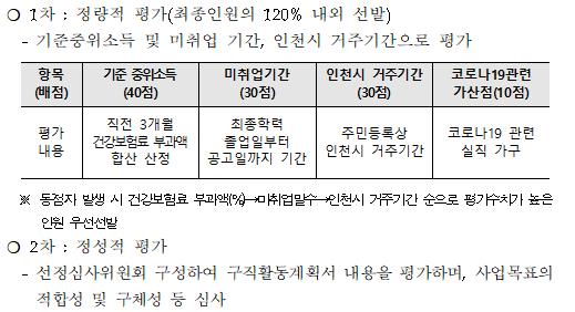 지원인원은 640명 내외로 가구소득, 미취업기간, 인천시 거주기간, 구직활동계획서 등을 종합적으로 심사해 선정되며, 코로나19로 인한 실직으로 생계가 곤란한 가구의 청년에게는 가산점이 부여된다.