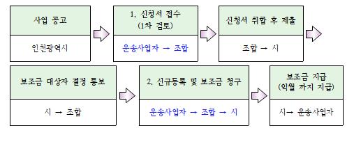 올해 1.1일 기준 차량 소유기간이 1년 이상인 인천시 택시 운송사업자로 기존 차량 대·폐차 등록말소 후 신차 등록까지 완료한 후에 신청할 수 있다. 다만, 대·폐차 등록말소 후 신차 등록일이 2022년 1월 1일 이후여야 한다.