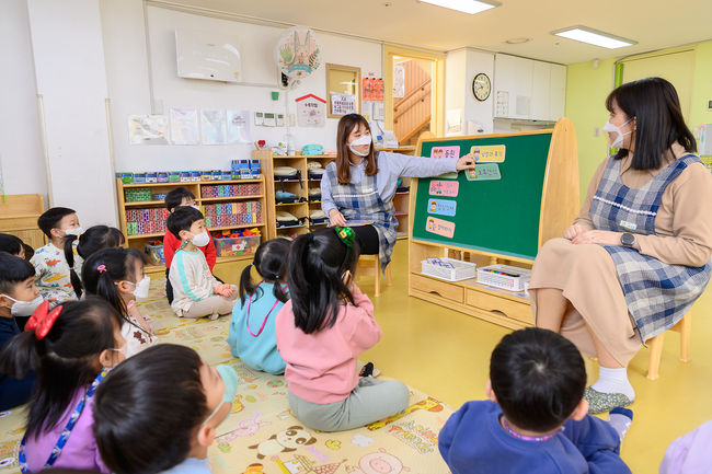 투명 마스크를 착용하고 수업 중인 구립신정2동어린이집 교사와 원아들
