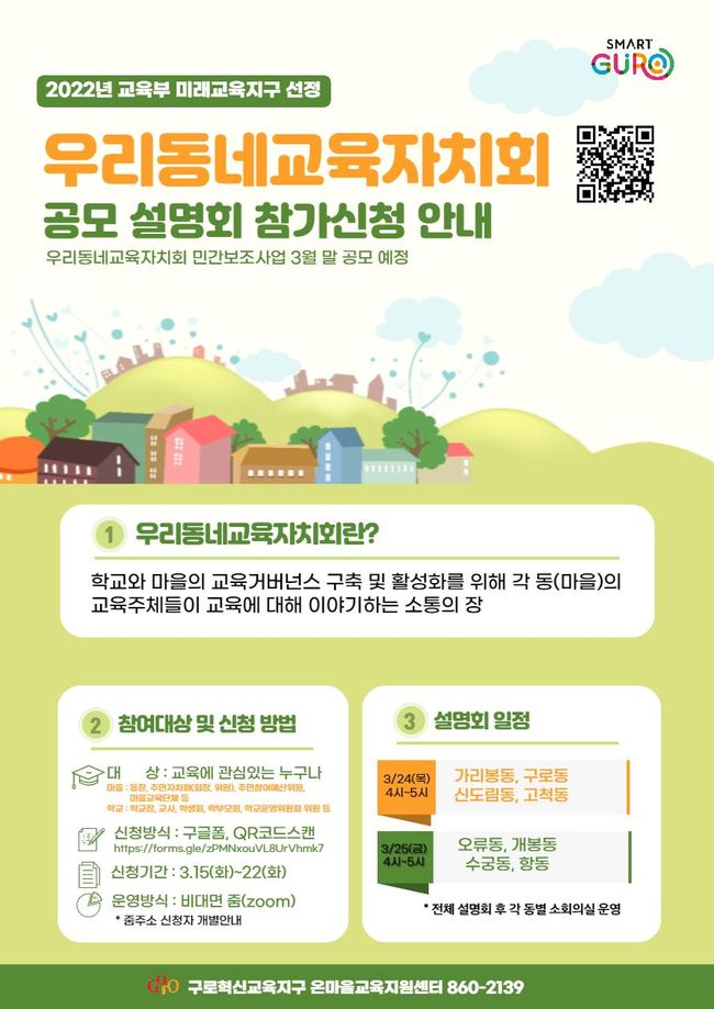 구로구 관계자는 “이번 설명회를 통해 ‘우리동네 교육자치회’ 주요사업 계획과 민간공모사업 등을 안내할 예정이다”며 “많은 주민의 관심과 참여를 바란다”고 전했다.