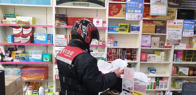 양천구 재택치료자 가정 현관에 처방약을 전달하는 대행업체 기사