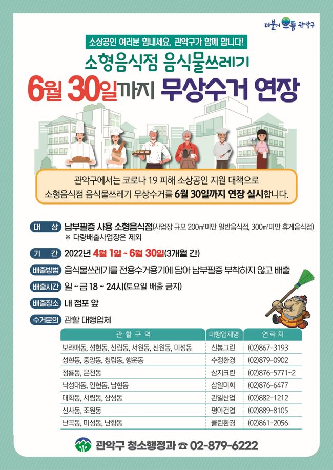 관악구가 이달 말 종료 예정이었던 소형음식점 대상 음식물쓰레기 무상 수거 기간을 6월 말까지 연장한다고 밝혔다.