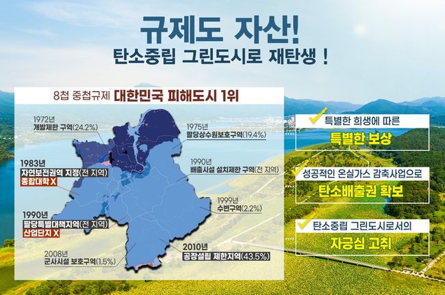 특히, 시는 8첩 중첩규제로 우리나라에서 가장 많은 규제를 받는 도시이고 특별한 희생에 따른 특별한 보상이 필요하며 이번 공모사업을 시작으로 성공적인 온실가스 감축 사업을 시행해 탄소중립 그린도시 선도모델로 재탄생하고자 한다고 강조했다.