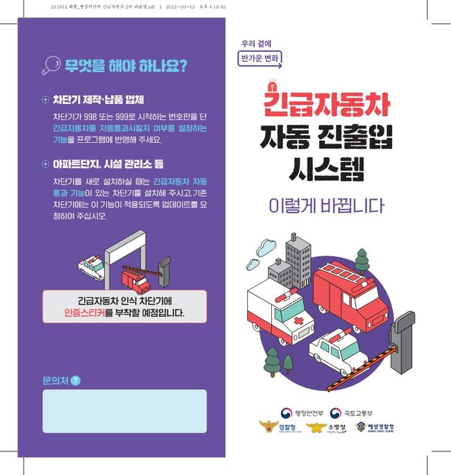 긴급자동차 자동진출입 시스템은 ‘자동차 등록번호판 등의 기준에 관한 고시’ 개정으로 지난해 11월부터 긴급자동차에 998~999로 시작하는 전용번호판 발급을 통해 무인차단기가 이 번호를 인식해 긴급자동차가 자동으로 진출입할 수 있게 이뤄졌다.
