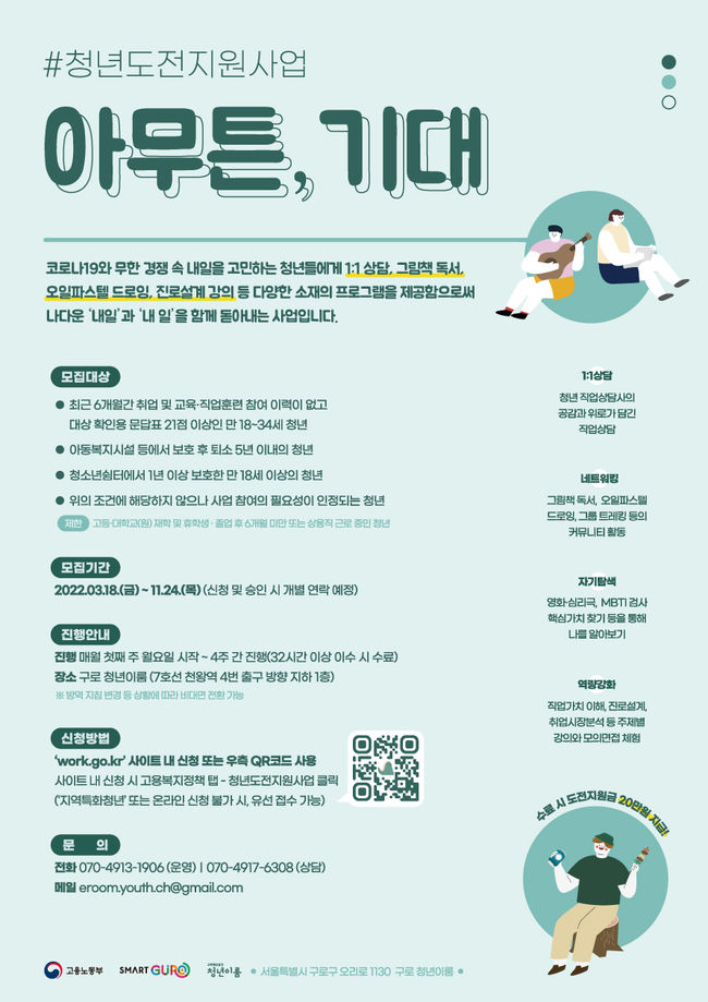 구로구는 “2022년 고용노동부가 주관하는 청년도전 지원사업 공모에 선정됐다”며 “이달부터 12월까지 250명의 청년을 대상으로 청년도전 지원사업을 진행한다”고 6일 밝혔다.