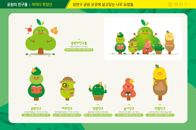 ‘정원도시 양천’ BI에는 사람과 사람 사이, 도시와 도시 속에서 휴식을 취하며 힘찬 내일을 준비하는 구민을 위한 ‘도심 속 공원’의 이미지를 담았다. ‘양천 공원의 친구들’ BI는 분야별 자원봉사자의 특징적인 모습을 캐릭터화했다.