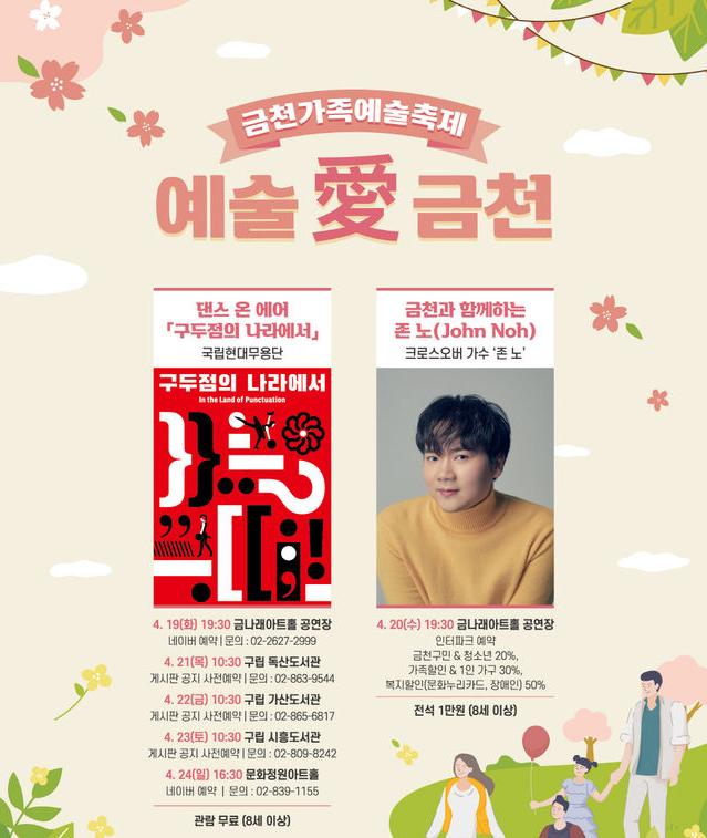 두 번째 프로그램은 4월 20일 크로스오버 가수 ‘존 노’의 공연이다. 금천지역 예술가인 존 노는 이날 피아노에 맞춰 데뷔 앨범 ‘NSQG’에 실린 주요 레퍼토리와 베토벤과 투리나의 가곡, 한국 가곡들을 선보일 예정이다.