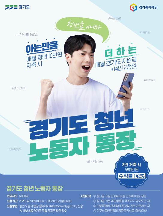 ‘경기도 청년 노동자 통장’은 청년이 2년 동안 근로활동을 유지하면서 매달 10만원을 저축하면 2년 후 경기도 지원금을 합쳐 약 580만원(지역화폐 100만원 포함)의 목돈을 마련하는 청년지원 사업이다.