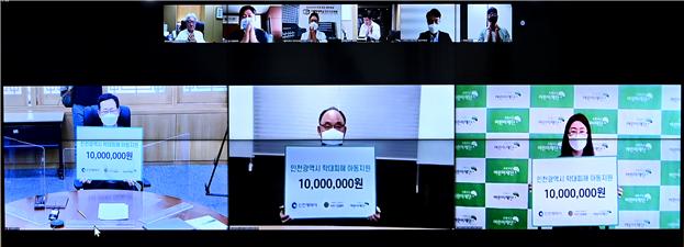 지난해 8월, 초록우산어린이재단과 학대피해아동 지원을 위한 나눔 캠페인 업무협약식(zoom 활용) 사진