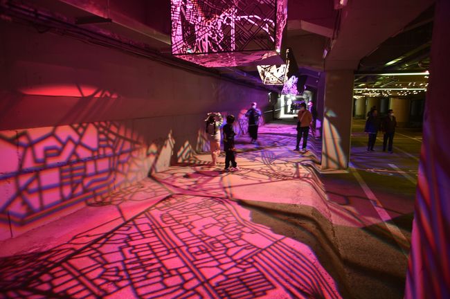 ▲벽면을 활용한 ‘달의 문이 열리다’는 당현천에 스며든 다양한 빛의 조각을 입체적으로 연출한 작품이다. 휴대폰 손전등으로 작품이 비추면 작품이 끊임없이 변화하면서 매 순간 새로운 빛의 모양을 볼 수 있도록 한 관객 참여형 작품이다. ▲‘월야의 심상’은 노원구를 구성하는 월계, 공릉, 하계, 중계, 상계동을 다면체 도형으로 시각화한 작품이다. ▲‘구르미 그린 달빛’은 구민의 행복에 대한 염원을 전통회화 방식으로 구현한 작품으로, 전통의 오방색과 색동에서 착안한 5개의 컬러를 형광 도료와 블랙라이트를 활용해 특별함을 더했다.
