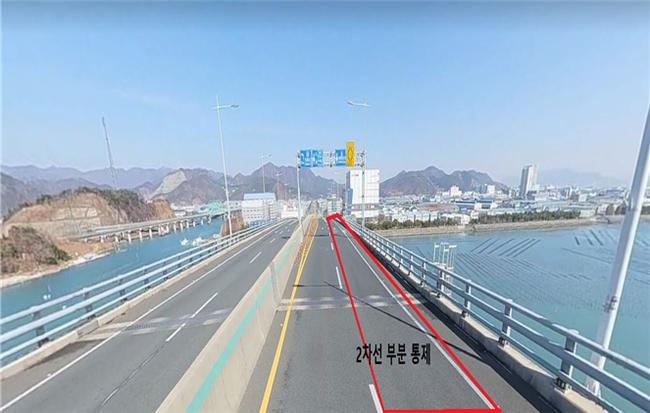 교통 통제가 진행되는 동안 가덕대교 녹산 방향 이용 차량은 1차선을 이용해야 하며, 교통신호수의 유도에 따라 반드시 서행 운전해야 한다.
