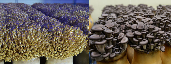 충북농기원 육성 버섯 신품종 내수시장 공략 돌입!(갈색 팽이버섯 여름향1호(왼쪽)과 느타리 버섯 수타리