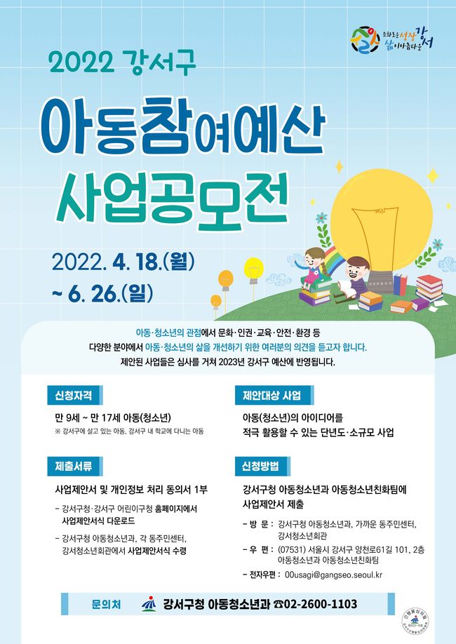 서울 강서구는 2023년도 예산편성을 위한 ‘아동참여예산 제안사업’을 공모한다고 밝혔다.