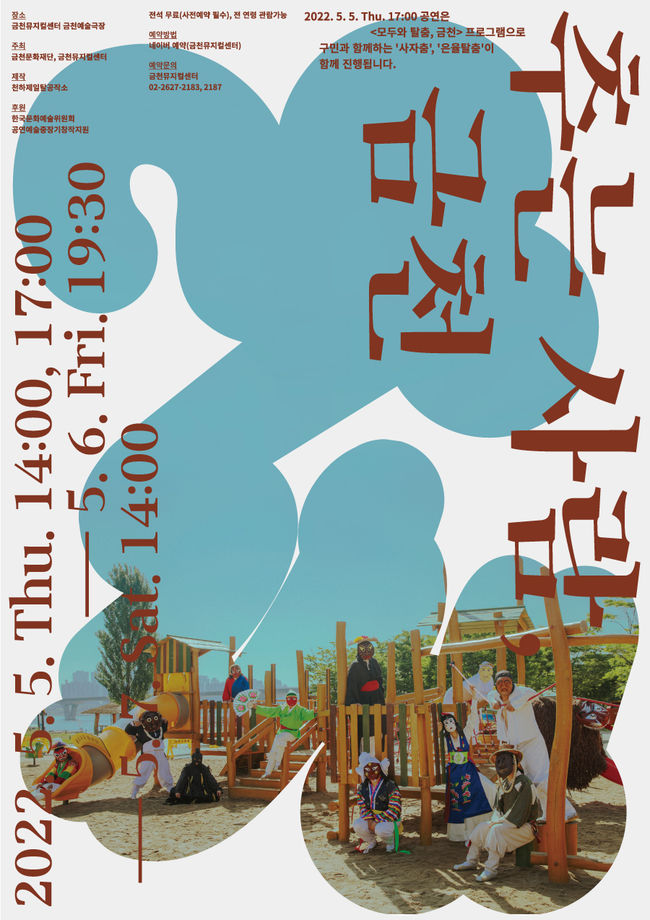 이번 공연은 △ 5월 5일(목) 오후 2시, 5시 △ 5월 6일(금) 오후 7시 30분 △ 5월 7일(토) 오후 2시 총 4회 진행된다. 특히 5월 5일 오후 5시 공연은 어린이날을 맞아 ‘모두와 탈춤, 금천’ 워크숍에 참여했던 가족 단위 참여자 30여 명이 천하제일탈공작소와 함께 하는 신명나는 탈춤공연 한마당이 펼쳐질 예정이다.