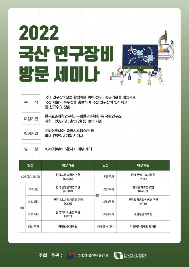 과학기술정보통신부(이하 ‘과기정통부’)는 국내 연구장비 산업의 활성화를 위해 정부·공공기관을 대상으로 국산 제품과 그 우수성을 홍보하는 `국산 연구장비 방문 세미나` 를 4월 26일을 부터 6월말까지 매주 개최한다고 밝혔다.