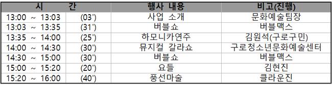 2일 대중에게 펭수 요들 선생님으로 알려진 이은경 씨의 요들 공연과 광대상자의 저글링을 시작으로, 9일에는 부활 보컬 출신의 가수 정단, 16일에는 블랙 어쿠스틱 듀오 서울형제와 여성 파워 보컬 쏘킴의 노래로 콘서트의 막을 내린다.