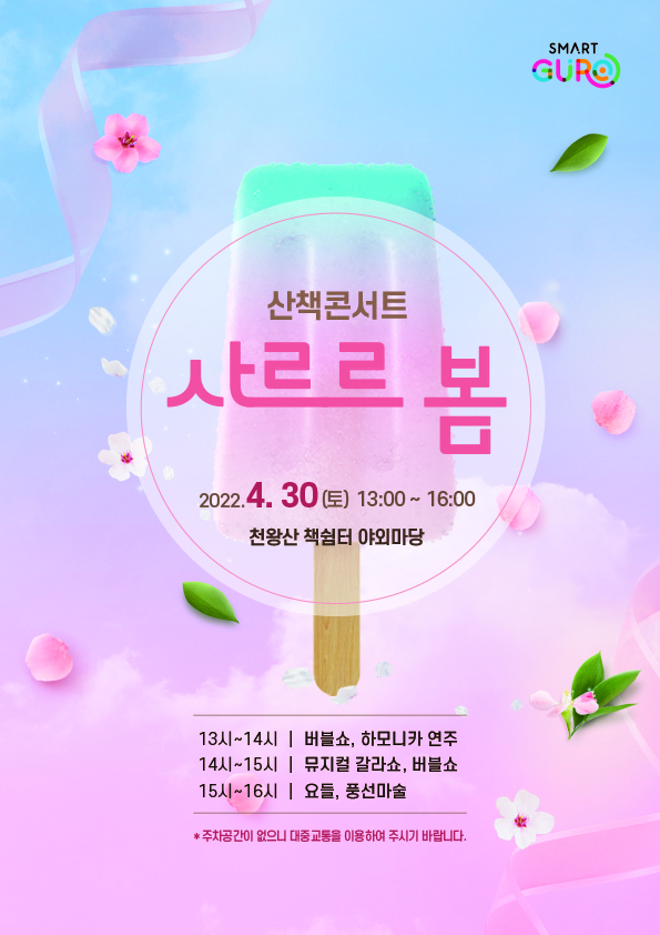먼저 오는 30일 천왕산책쉼터에서 ‘사르르 봄’ 콘서트를 진행한다. 오후 1시부터 4시까지 버블맥스의 버블쇼, 구로구민 김원석 씨의 하모니카 연주, 구로청소년문화예술센터팀의 뮤지컬 갈라쇼, 김현진 씨의 요들송, 클라운진의 풍선마술 등이 펼쳐진다.
