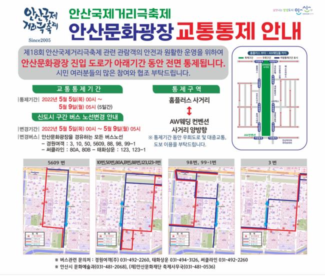 또 국제거리극축제 개최에 따라 5일 오전 0시부터 9일 오전 5시까지 안산문화광장 홈플러스 사거리부터 AW웨딩 컨벤션 사거리 양방향 진입 도로는 통제되며, 이 구간을 지나는 일부 버스노선도 우회 운행한다.