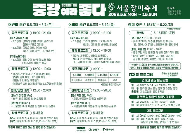 2022 서울장미축제는 어린이, 어버이, 장미 총 세 가지 테마로 프로그램을 운영한다. 아이와 함께 즐기는 공연과 체험 프로그램 등으로 구성된 ‘어린이 주간’이 어린이날인 5일부터 7일까지 진행됐다. 8일부터 12일까지 운영하는 ‘어버이 주간’은 부모님과 관람할 수 있는 ‘로즈무비나잇’ 등의 프로그램과 함께한다. 15일부터 22일까지는 장미 개화식으로 문을 여는 ‘장미 주간’이다. ‘플로깅’, ‘로즈패션쇼’, ‘개화공연 `중랑, 사람 꽃`’이 진행되는 15일 개화식을 기점으로 장미꽃이 만발한 풍경을 즐길 수 있다.
