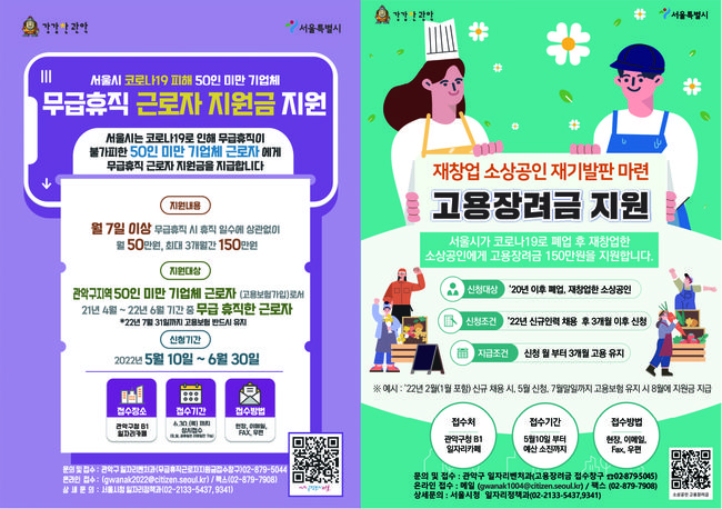 관악구가 코로나19 장기화로 어려움을 겪는 소상공인, 무급휴직 근로자의 재기발판과 민생경제 활력회복을 위해 ‘무급휴직지원금’ 및 ‘고용장려금’ 신청을 받는다고 밝혔다.