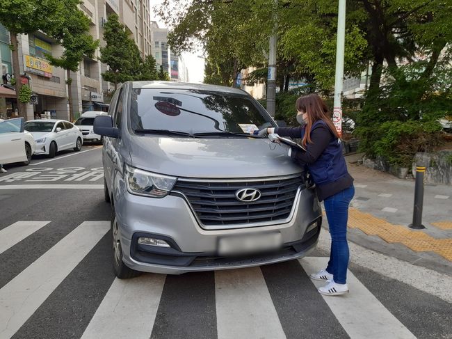 단속원이 현장에서 수기로 불법주정차를 단속하는 모습