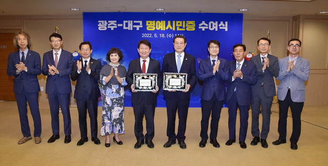 광주광역시는 달빛동맹의 성공적 추진으로 동서화합과 시정발전에 기여한 공로로 18일 시청 비즈니스룸에서 권영진 대구광역시장에게 116번째 광주광역시 명예시민증을 수여했다고 밝혔다.