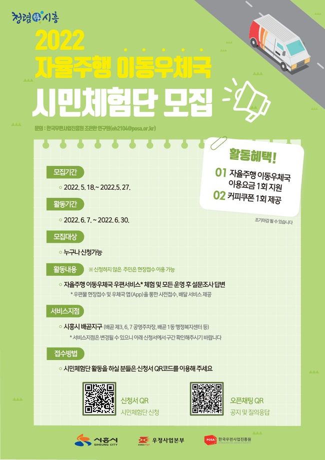 시흥시는 다양한 지역에 적용 가능한 비대면 자율주행 이동우체국 개발과 실증을 위해 한국우편사업진흥원이 주관하는`자율주행 이동우체국`의 시민체험단을 5월 18일부터 27일까지 모집한다고 밝혔다.
