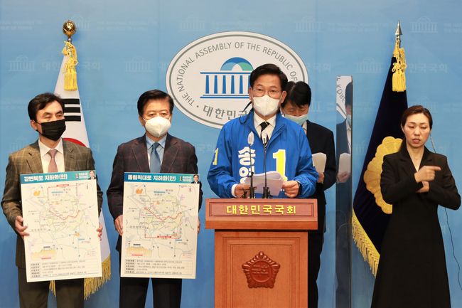 송영길 더불어민주당 서울시장 후보가 20일 오전 서울 여의도 국회 소통관에서 기자회견을 열고 15조원 규모의 예산을 투자하여 강변북로와 올림픽대로를 지하화하고 시민들의 한강 접근성을 높이는 내용의 공약을 발표했다. 송 후보는 이러한 내용을 담은 ‘바로한강’ 프로젝트를 발표하면서 “이 프로젝트가 완성되면 한강에 올림픽대로가 설치된 지 40년 만에 지하화하고 녹생공원 한강을 회복하는 의미가 있다”고 설명했다.