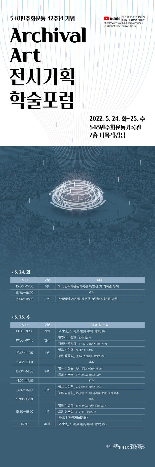 이번 전시기획 학술포럼에서는 5·18민주화운동 42주년을 맞아 아카이브 아트의 최근 경향성을 통해 기록관 전시의 미학적 태도와 방식을 고찰하고 역사와 기억에 어떻게 접근해야 하는지를 논의한다.
