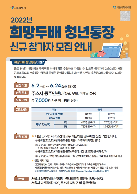 먼저 청년 목돈 마련을 위한 ‘희망두배 청년통장’은 공고일(2022.5.23.) 현재 서울시에 거주하는 만 18~34세 이하 근로 중인 청년을 대상으로 한다.