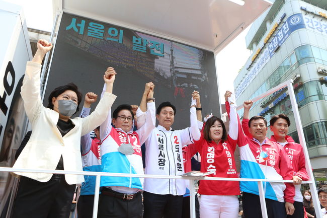 오세훈 국민의힘 서울시장 후보는 박강수 마포구청장 후보를 비롯한 마포지역 시의원 출마자들과 함께 국민의힘 후보자들에게 표를 던져줄 것을 호소했다.이날 오 후보는 박강수 마포구청장 후보를 비롯한 마포지역 시의원 출마자들과 함께 국민의힘 후보자들에게 표를 던져줄 것을 호소했다.
