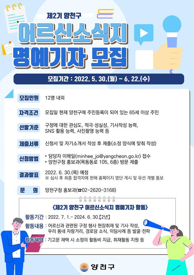 모집대상은 양천구에 주민등록이 되어있는 65세 이상 구민으로, 구정에 관심이 많으면서 직접 취재와 기사(기고문 등) 작성 및 SNS 활동이 가능한 자여야 한다.