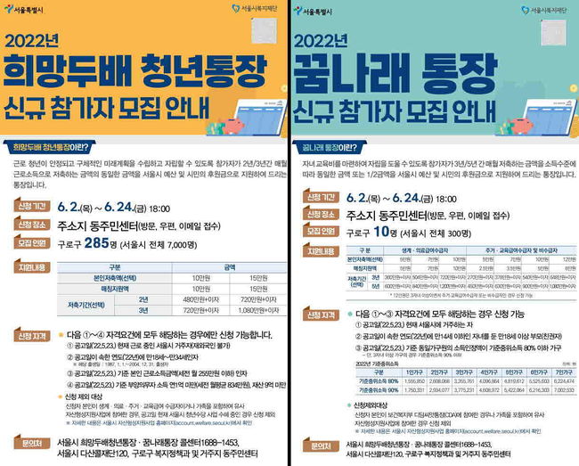 구로구가 이달 24일까지 ‘희망두배 청년통장’ 참가 희망자 285명과 ‘꿈나래 통장’ 가입 희망자 10명을 모집한다고 밝혔다.