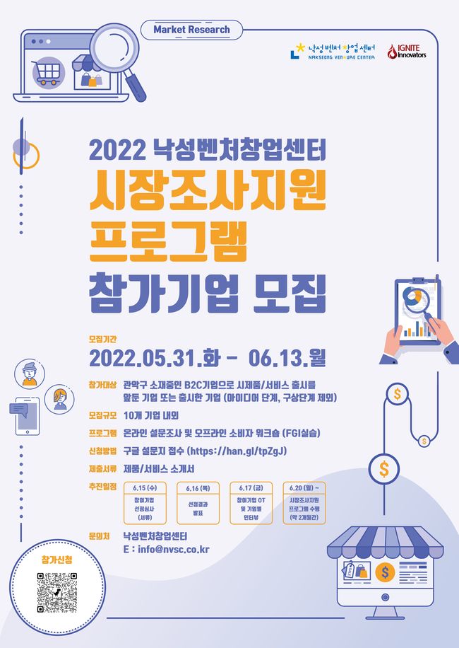 모집 기간은 오는 6월 13일까지이며, 구글 설문지를 통해 신청서를 작성하고 제품이나 서비스의 소개서를 첨부 후 접수하면 된다. 모집 결과는 선정 심사를 거쳐 6월 16일 발표되며, 참여기업은 6월 17일 낙성벤처창업센터에서 진행되는 프로그램 OT에 참석해야 한다.