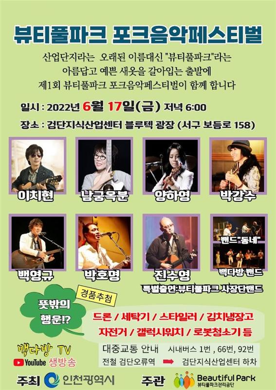 인천광역시는 오는 17일 저녁 6시부터 2시간 동안 뷰티풀파크 내 검단지식산업센터 블루텍 에코존 광장에서 ‘뷰티풀파크 포크음악페스티벌’을 개최한다고 밝혔다.
