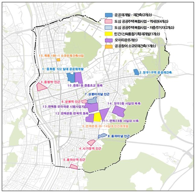 기존 후보지로 선정됐던 13곳에서 새로 선정된 모아타운 1곳과 묵동 장미아파트 소규모재건축사업 1곳이 추가 돼 지역 내 개발 후보지는 총 15곳이 됐다.