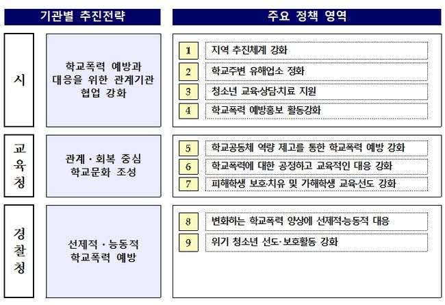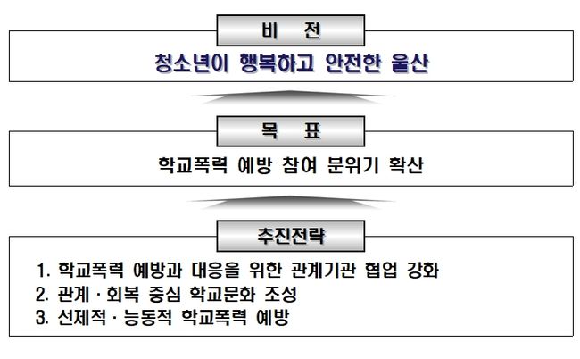 2022년 학교폭력 예방대책(안)은 ‘청소년이 안전하고 행복한 울산’을 비전으로 △학교폭력 예방과 대응을 위한 관계기관 협업 강화, △관계·회복 중심 학교문화 조성, △선제적·능동적 학교폭력 예방’ 등 3개 전략, 9개 주요사업, 24개 세부사업으로 구성되어 있다.