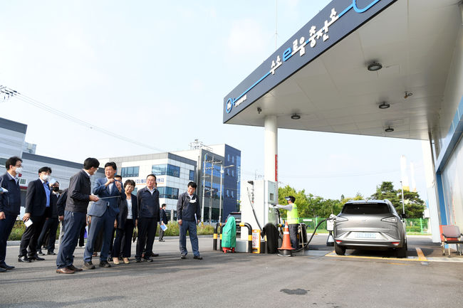 이민근 안산시장이 11일 안산도시개발을 방문해 수소e 로움 충전소에 관한 설명을 듣고있다.