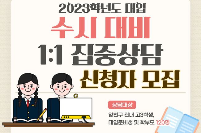양천구는 2023학년도 수시 전형을 준비하는 수험생과 학부모를 대상으로 8월 8일과 9일, 양일간 해누리타운 아트홀에서 `대입 수시전형 대비 1:1 집중 상담`을 운영한다.