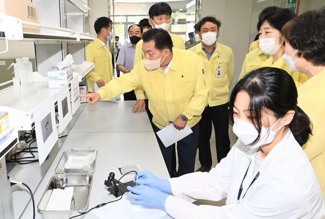 이재준 수원특례시장이 지난 15일 수원시상수도사업소 정수 공정 현장을 점검하고 있다.