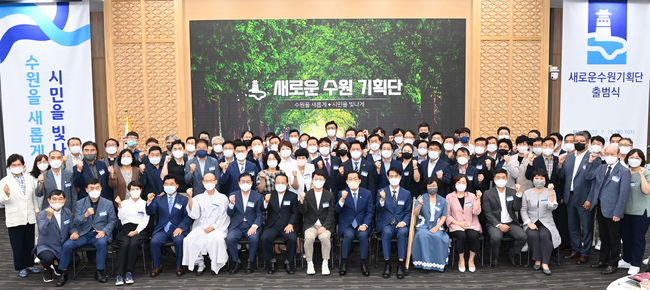 지난 14일 수원시민과 전문가들로 구성된 새로운 수원 기획단이 출범식 후 기념사진을 찍고 있다.