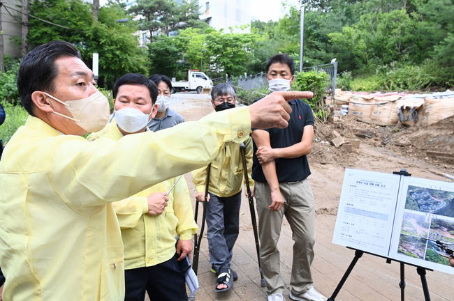 지난 1일 취임식을 취소하고 수해 피해지역을 방문한 이재준 수원특례시장이 현장을 점검하고 있다.