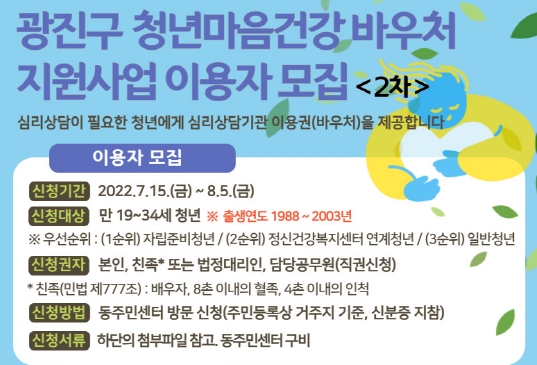 광진구가 심리상담이 필요한 청년에게 심리상담기관 이용권을 제공하는 ‘광진구 청년마음건강 바우처 지원사업’ 이용자를 모집한다고 밝혔다.