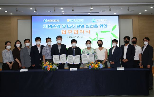 인천광역시는 29일 한국환경공단, NH농협은행 인천영업본부와 함께 ‘자원순환 및 ESG 경영 실천을 위한 폐현수막 새활용 시범사업 업무협약’을 체결했다고 밝혔다.